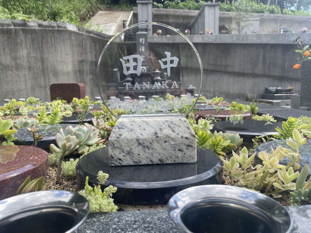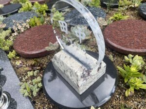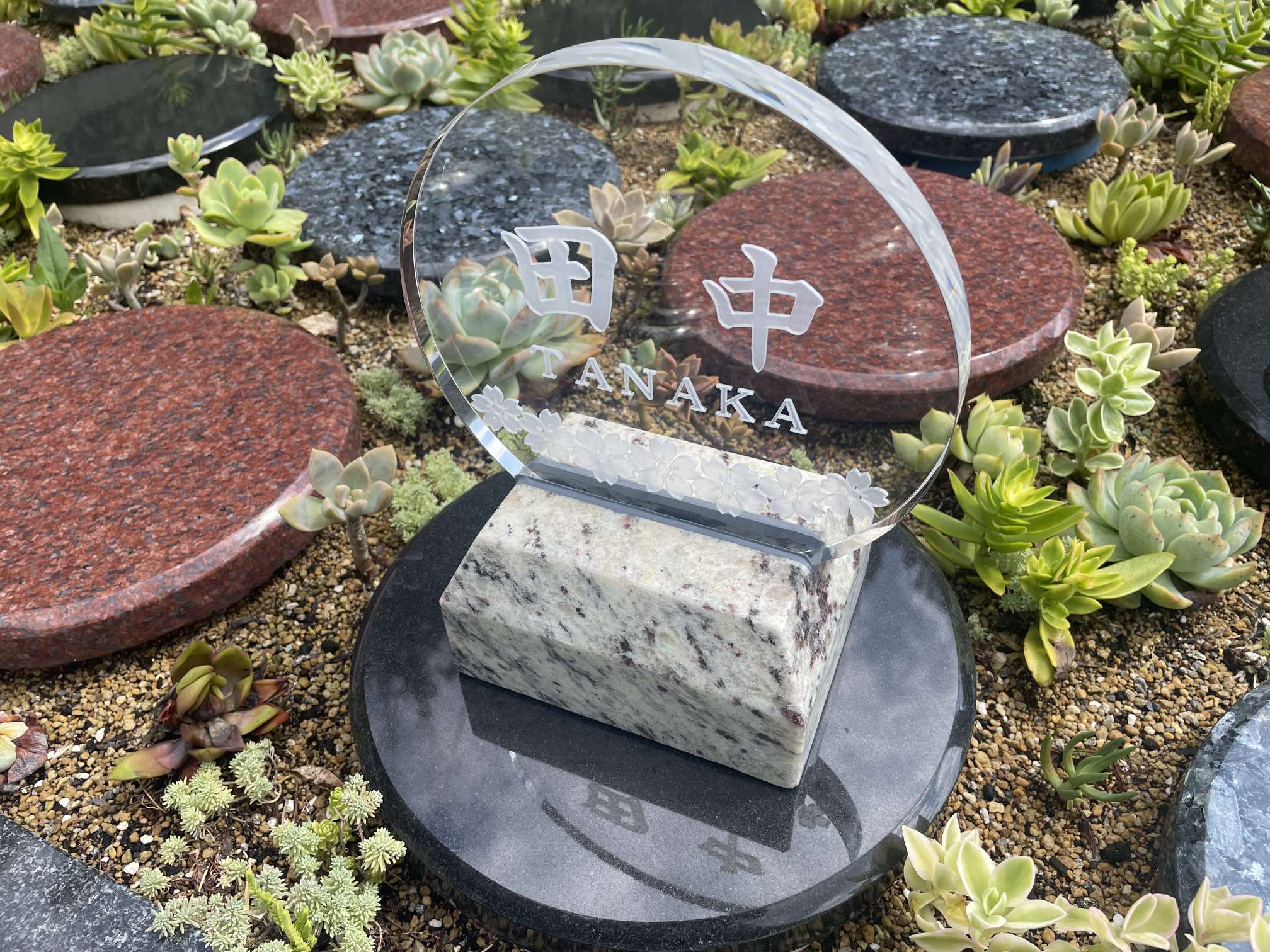 円形のガラスにお好みの書体でレーザー彫刻出来ます。 御影石とガラスはとても相性が良いと思います。 かわいい花柄など、お好みに合わせてエッジの効いたデザインも承ります。